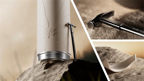 格蘭路思51年以顛覆性的“破繭”設(shè)計(jì),重新定義威士忌的開啟儀式。酒瓶密封于特制環(huán)保復(fù)合材料Jesmonite(天然礦物粉與水性樹脂復(fù)合物)制成的圓柱形外包裝中,藏家需使用附贈定制工具破除外殼,方能見證杰作真容。這一“破繭”儀式,既是對探索精神的呼應(yīng),亦是對“蛻變”的詮釋:破碎的外殼并非終結(jié),而是新生的起點(diǎn)。