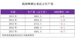 2017年我國啤酒產(chǎn)量4401.5萬千升 連續(xù)四年產(chǎn)量下降 日期:2018-01-23 08:05:10