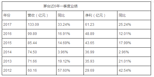 貴州茅臺2017一季度營收、凈利增速近5年新高
