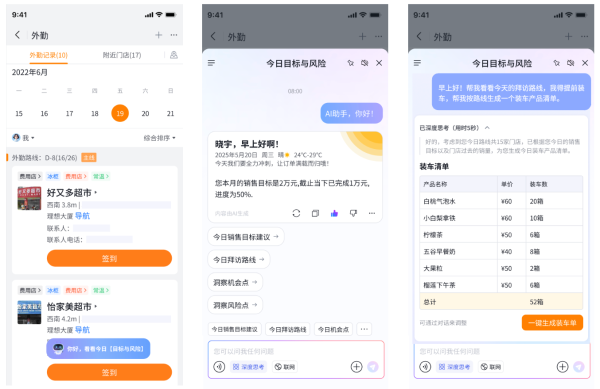 AI訪銷大腦迅速響應:“今日路線共15家門店, 已根據路線上的門店及今日銷售目標綜合分析, 為您生成裝車清單......"