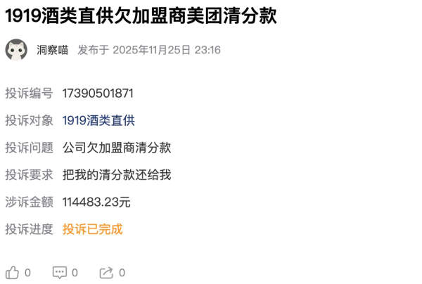 佳釀網(wǎng)注意到,直至11月25日,黑貓投訴平臺(tái)上仍有供應(yīng)商發(fā)布關(guān)于1919拖欠貨款的投訴信息,顯示相關(guān)資金糾紛仍在延續(xù)。